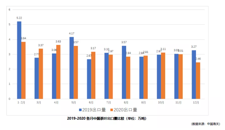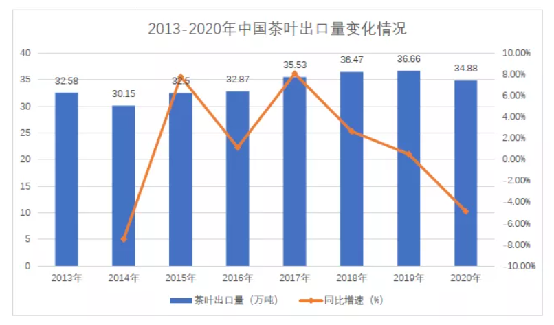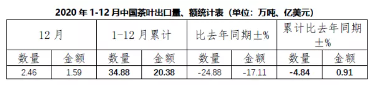 2020年1-12月,中国茶叶出口量总计为34.88万吨,比2019年全年减少1.77万吨,同比减少4.84%;这是自2014年以来,中国茶叶出口量首次出现下降。