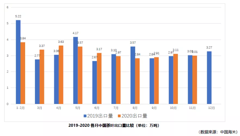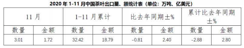 2020年1-11月,中国茶叶累计出口量为32.42万吨,同比减少2.88%;累计出口额为18.79亿美元,同比增加2.8%;出口均价为5.79美元/千克,同比上涨5.85%。
