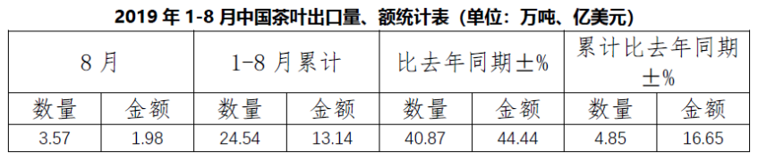 据中国海关数据,2019年8月,中国茶叶出口量为3.57万吨,出口额为1.98亿美元,同比分别增长40.87%、44.44%,8月出口均价为5.55美元/千克,比去年同期上涨2.53%。