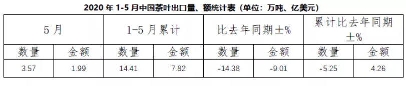2020年1-5月,中国茶叶累计出口量为14.41万吨,同比减少5.25%;累计出口额为7.82亿美元,同比增加4.26%;出口均价为5.43美元/千克,同比上涨10.03%。