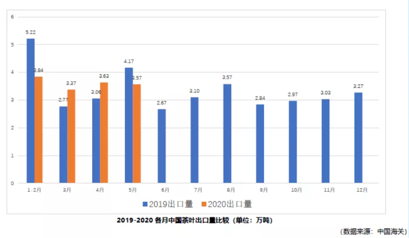 据中国海关统计,2020年5月,中国茶叶出口量为3.57万吨,同比减少14.38%;出口额为1.99亿美元,同比减少9.01%;出口均价为5.59美元/千克,比去年同期增长6.28%。
