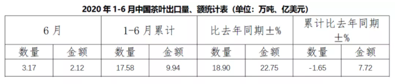 据中国海关统计,2020年6月,中国茶叶出口量为3.17万吨,同比增长18.90%;出口额为2.12亿美元,同比增长22.75%;出口均价为6.69美元/千克,比去年同期增长3.24%。