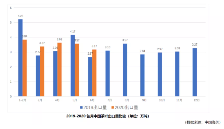综合来看。2020年上半年,中国茶叶出口量各月波动性相对较大,在1-2月、5月出现同比10%以上降幅,其余月份有10%以上涨幅,各月出口量波动较大;中国茶叶出口均价持续提升,2020年上半年,中国茶叶出口均价延续近年来上涨势头,全茶类出口均价都有不同幅度提升,整体涨幅达到9.52%,同时带动出口额上涨7.72%;茶叶出口受到全球新冠肺炎疫情影响,但总体有限,近年中国茶叶出口量保持上升态势,因上半年出现的新冠肺炎疫情,使得国际贸易受阻,进出关渠道不畅,对我国茶叶出口造成一定影响,出口量总体微降1.65%,相较于上半年全国出口3%的降幅,影响相对有限。