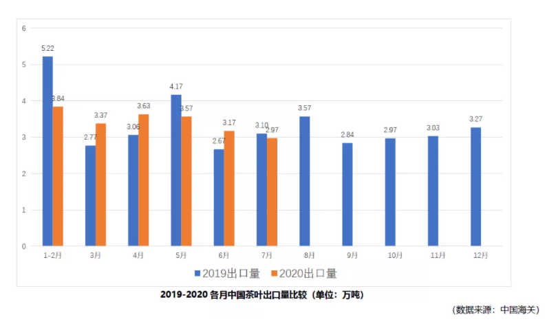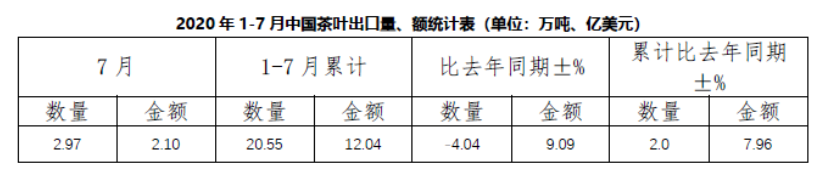 据中国海关统计,2020年7月,中国茶叶出口量为2.97万吨,同比减少4.04%;出口额为2.10亿美元,同比增加9.09%;出口均价为7.07美元/千克(注:该价格创2020年月度出口均价新高),比去年同期增长13.67%。