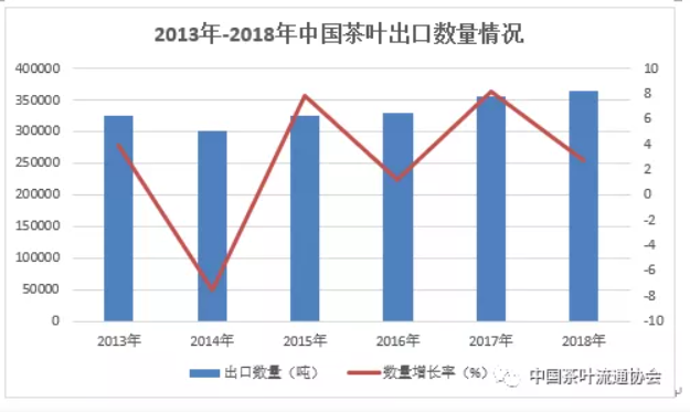 据中国海关数据,2018年中国茶叶出口量维持增长趋势,茶叶出口量为36.47万吨,年增长9484吨,同比增2.7%,涨势虽然比2017年(8.1%)有所下降,但高于2016年(1.2%)。近年我国茶叶出口基本保持平稳增长,仅在2014年有小幅减量,之后2014年-2017年茶叶出口量呈增长趋势,2017年中国茶叶出口量为35.5万吨,同比增长8.1%。