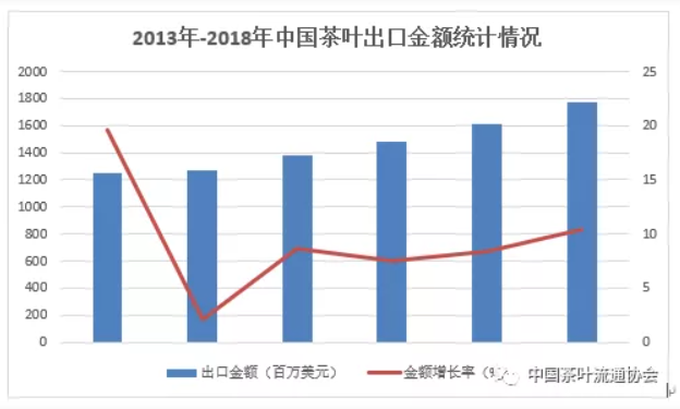 从出口金额方面观测,2018年中国茶叶出口金额为17.78亿美元,增1.68亿美元,同比增长10.4%,增势不断提升。2013年-2018年,我国茶叶出口金额始终保持增长的态势,共增长5.31亿美元。2017年中国茶叶出口额为16.1亿美元,同比增长8.4%。