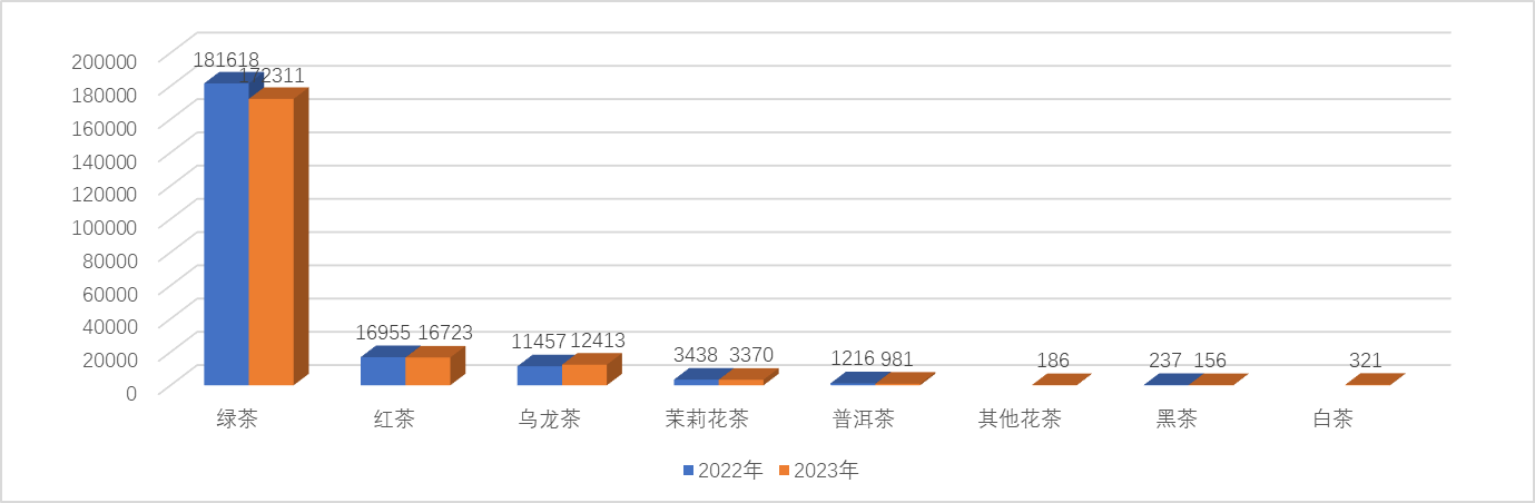 分茶类看。2023年1-7月,中国绿茶出口量为17.23万吨,占总出口量比重为83.5%,减少9307吨,降幅5.1%;红茶出口量为1.67万吨,占总出口量比重为8.1%,减少231吨,降幅1.4%;乌龙茶出口量为1.24万吨,占总出口量比重为6.0%,增加957吨,增幅8.4%;茉莉花茶出口量为3370吨,占总出口量比重为1.6%,减少68吨,降幅2.0%;普洱茶出口量为981吨,占总出口量比重为0.5%,减少235吨,降幅19.3%;此外,白茶出口量为321吨,其他花茶出口量为186吨,黑茶出口量为156吨。