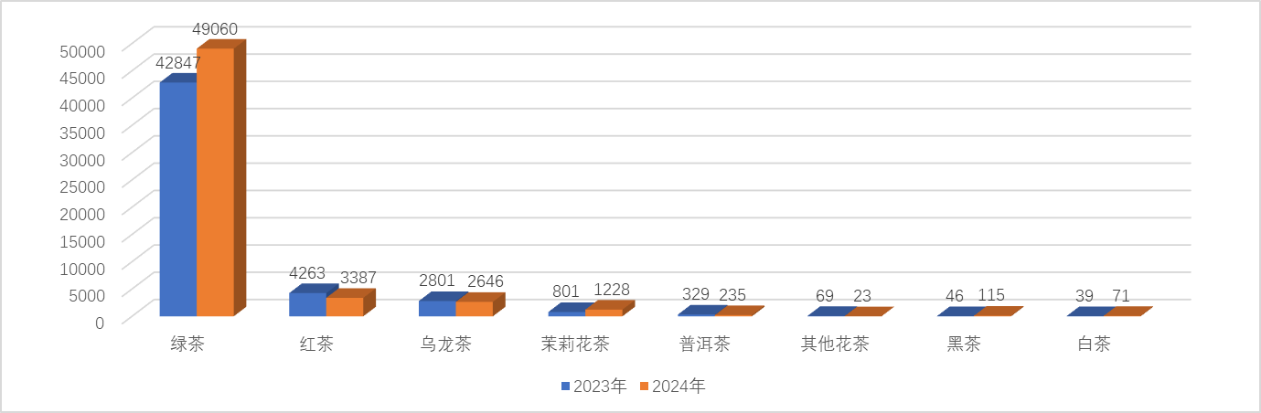 分茶类看。2024年1-2月,中国绿茶出口量为4.91万吨,占总出口量比重为86.4%,增加6213吨,增幅14.5%;红茶出口量为3387吨,占总出口量比重为6.0%,减少876吨,降幅20.5%;乌龙茶出口量为2646吨,占总出口量比重为4.7%,减少155吨,降幅5.5%;茉莉花茶出口量为1228吨,占总出口量比重为2.2%,增长428吨,增幅53.4%;普洱茶出口量为235吨,占总出口量比重为0.4%,减少95吨,降幅28.7%;其他花茶出口量为23吨,黑茶出口量为115吨,白茶出口量为71吨。