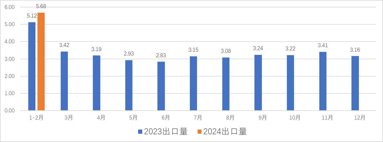 2023-2024各月中国茶叶出口量比较(单位:万吨)
