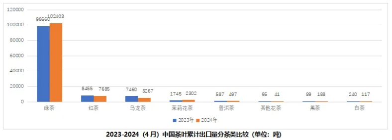 分茶类看。2024年1-4月,中国绿茶出口量为10.24万吨,占总出口量比重为83.3%,增加3743吨,增幅3.8%;红茶出口量为7685吨,占总出口量比重为7.1%,减少770吨,降幅9.11%;乌龙茶出口量为5267吨,占总出口量比重为6.3%,减少2193吨,降幅29.4%;茉莉花茶出口量为2302吨,占总出口量比重为1.5%,增长557吨,增幅32.0%;普洱茶出口量为497吨,占总出口量比重为0.5%,减少89吨,降幅15.2%;其他花茶出口量为41吨,黑茶出口量为188吨,白茶出口量为117吨。