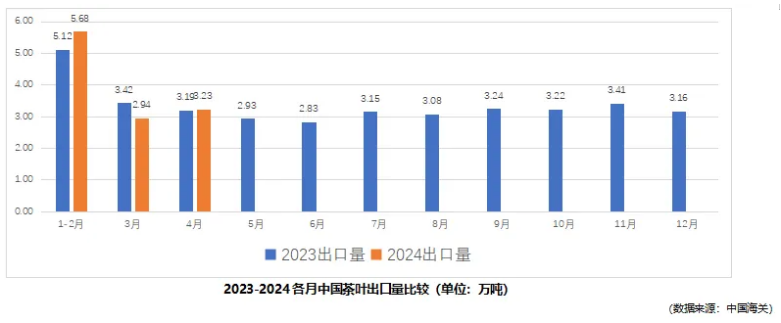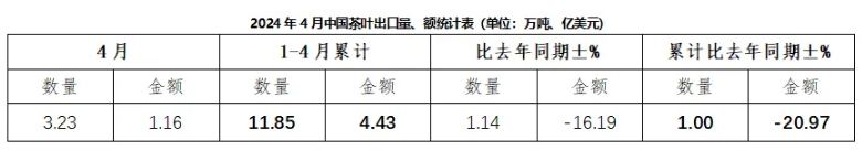 据中国海关数据,2024年4月,中国茶叶出口量为3.23万吨,同比增长1.14%,出口额为1.16亿美元,同比减少16.19%,4月出口均价为3.60美元/千克,比去年同期下降17.14%。