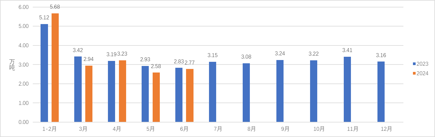 据中国海关数据,2024年6月,中国茶叶出口量为2.77万吨,同比减少2.26%,出口额为1.10亿美元,同比减少20.45%,6月出口均价为3.98美元/千克,比去年同期下降18.61%。
