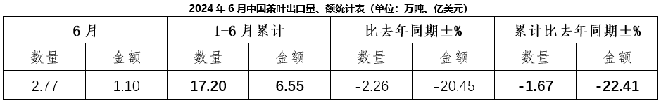 截至6月,2024年中国茶叶累计出口量为17.20万吨,同比减少1.67%,累计出口额为6.55亿美元,同比减少22.41%,1-6月出口均价为3.81美元/千克,比去年同期下降21.09%。