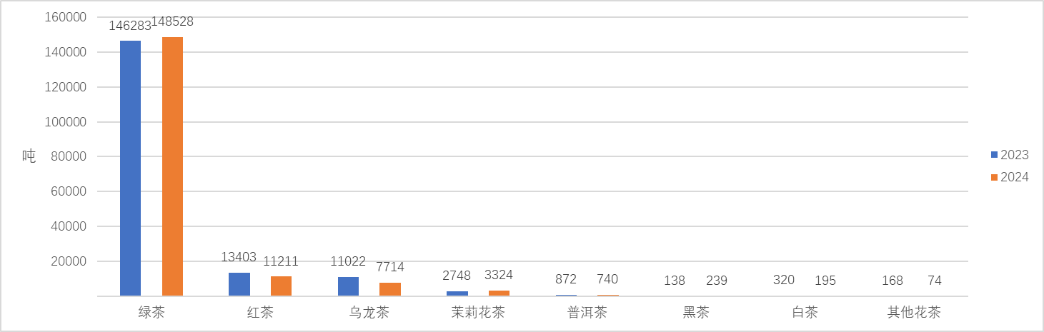2023-2024(1-6月)中国茶叶累计出口量分茶类比较(单位:吨)