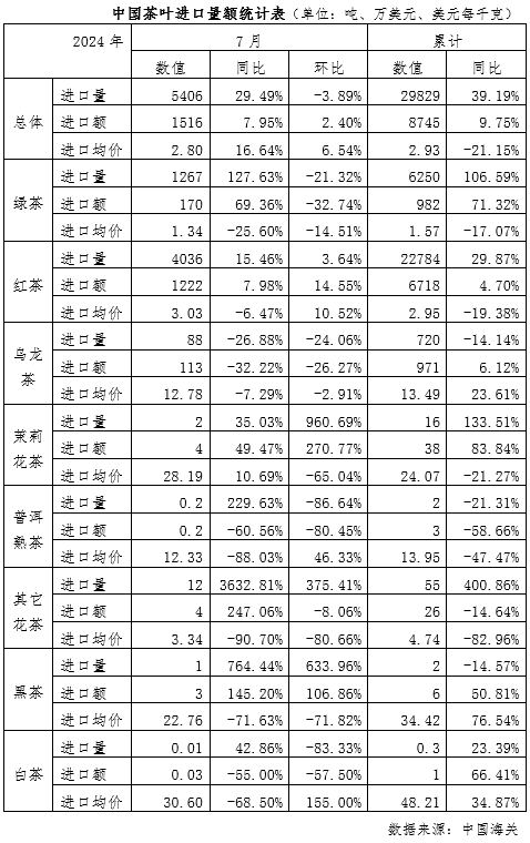 截至7月,2024年中国茶叶累计进口量为29829吨,同比增加39.19%,累计进口额为8745万美元,同比增加9.75%,1-7月进口均价为2.93美元/千克,同比下降21.15%。