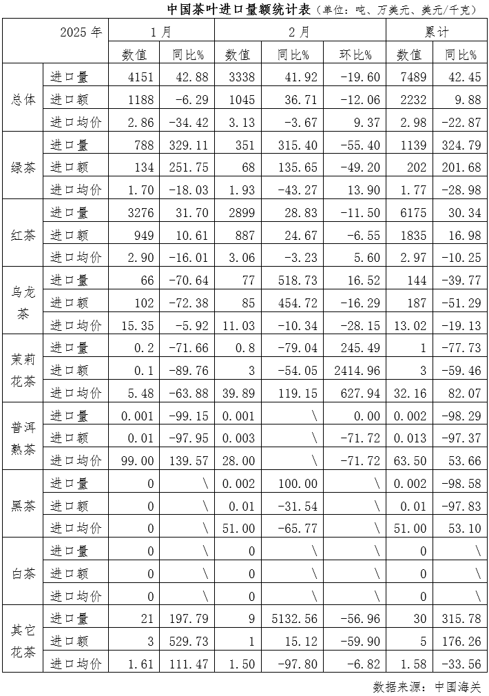 截至2月,2025年中国茶叶累计进口量为7489吨,同比增加42.45%;累计进口额为2232万美元,同比增加9.88%;进口均价为2.98美元/千克,同比下降22.87%。
