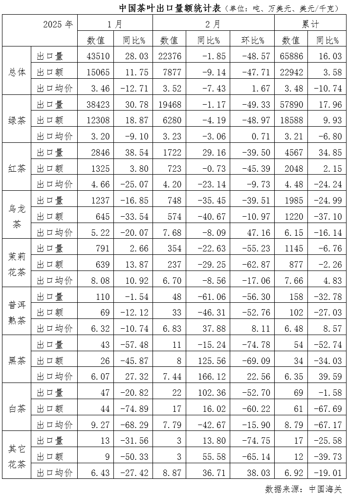 截至2月,2025年中国茶叶累计出口量为6.59万吨,同比增加16.03%;累计出口额为2.29亿美元,同比增加3.58%;出口均价为3.48美元/千克,同比下降10.74%。