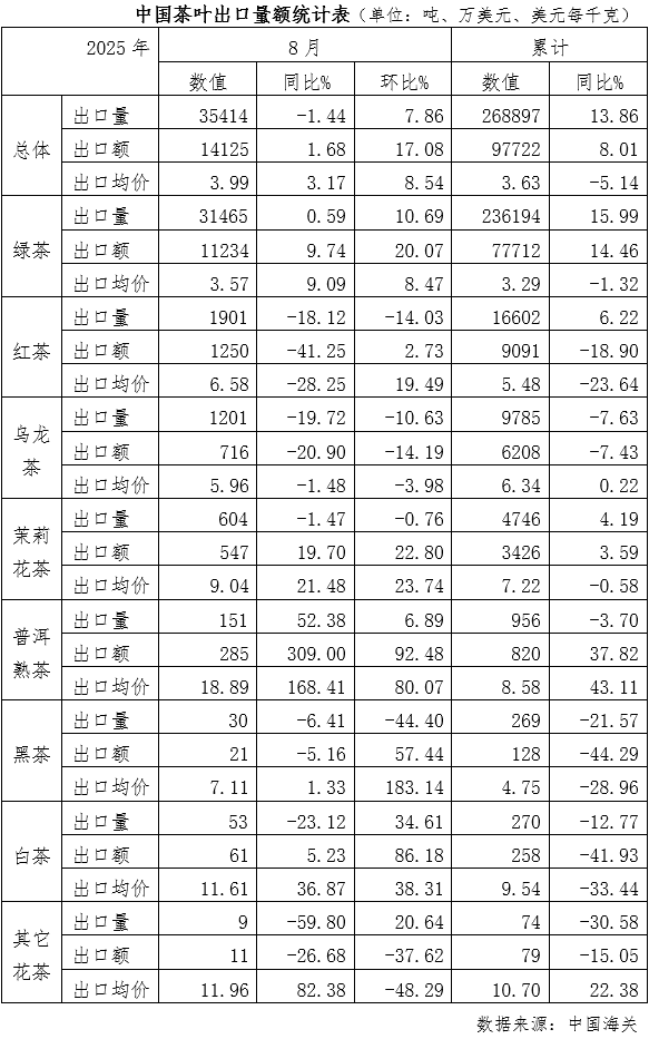 2025年1-8月,中国茶叶出口总量为26.89万吨,同比增加13.86%;出口总额为9.77亿美元,同比增加8.01%;出口均价为3.63美元/千克,同比下降5.14%。