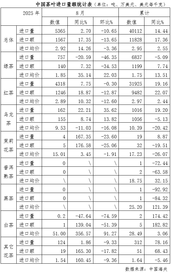 据中国海关数据:2025年8月,中国茶叶进口量为5365吨,同比增加2.70%,环比减少10.65%;进口额为1567万美元,同比增加17.35%,环比减少13.65%;进口均价为2.92美元/千克,同比上涨14.26%,环比下降3.36%。2025年1-8月,中国茶叶进口总量为4.01万吨,同比增加14.44%,进口总额为1.18亿美元,同比增加17.36%;进口均价为2.95美元/千克,同比上涨2.55%。