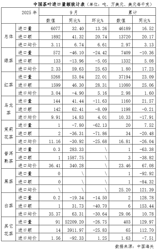 据中国海关数据:2025年9月,中国茶叶进口量为6077吨,同比增加32.40%,环比增加13.26%;进口额为1892万美元,同比增加41.32%,环比增加20.74%;进口均价为3.11美元/千克,同比上涨6.74%,环比上涨6.61%。