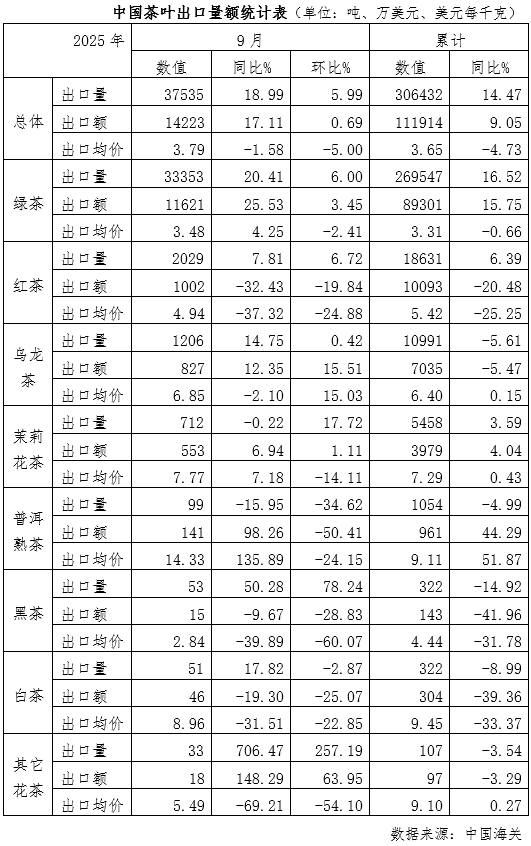 据中国海关数据:2025年9月,中国茶叶出口量为3.75万吨,同比增加18.99%,环比增加5.99%;出口额为1.42亿美元,同比增加17.11%,环比增加0.69%;出口均价为3.79美元/千克,同比下降1.58%,环比下降5.00%。