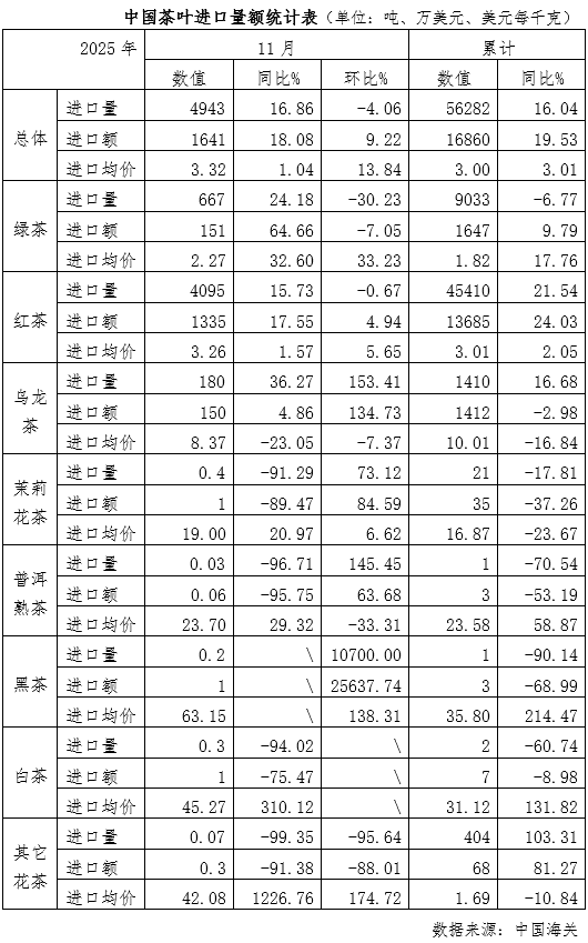 据中国海关数据:2025年11月,中国茶叶进口量为4943吨,同比增加16.86%,环比减少4.06%;进口额为1641万美元,同比增加18.08%,环比增加9.22%;进口均价为3.32美元/千克,同比上涨1.04%,环比上涨13.84%。