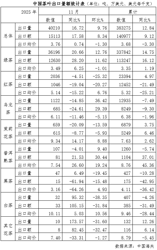 2025年1-11月,中国茶叶出口总量为38.33万吨,同比增加12.84%;出口总额为14.10亿美元,同比增加9.12%;出口均价为3.68美元/千克,同比下降3.30%。