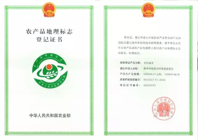 根据2014年贵州省人民政府《贵州省茶产业提升三年行动计划(2014-2016年)》(黔府办发〔2014〕19号)文件相关要求,在贵州省内各级有关部门、专家学者和众多茶企整整三年共同努力下,2017年1月,国家农业部发文批复,根据《农产品地理标志管理办法》规定,“贵州绿茶”获颁中华人民共和国农产品地理标志登记证书,成为全国首个省级茶叶类国家地理标志产品。
