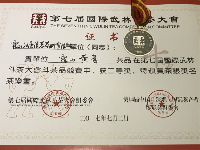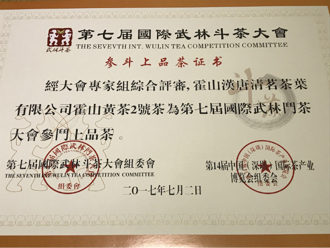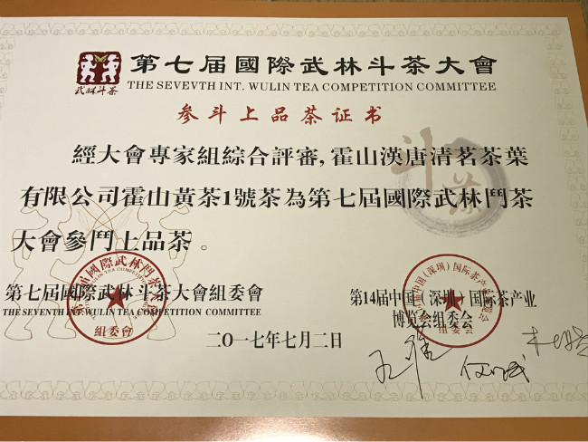2017年7月2日,霍山汉唐清茗茶叶有限公司提供的两款黄茶产品在第七届国际武林斗茶大赛分获黄茶类银奖与优胜奖,也是本次大赛极少同获得两个奖项的单位。本届大赛是国内外茶人的盛会,是增进交流、切磋技艺、发扬茶人精神的平台,深圳茶博会的茶会现场人数高达数十万人次,参赛队共达700余支。