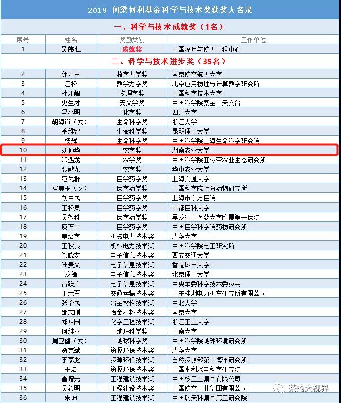 11月18日,2019年度何梁何利基金奖获奖名单正式出炉,56位科技领军人物获奖,其中,国家植物功能成分利用工程技术研究中心主任、湖南农业大学博士生导师、著名茶学专家刘仲华教授获得科学与技术进步奖中的农学奖,这也是中国茶学领域第一次获得该大奖!