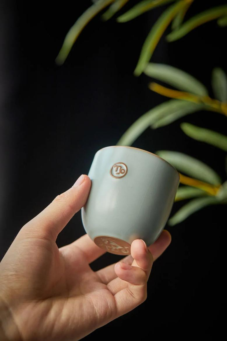杯身釉面简洁明朗,通体呈现出的如凝脂一般的天青色,侧身上的线条简约流畅,极具现代审美气质。