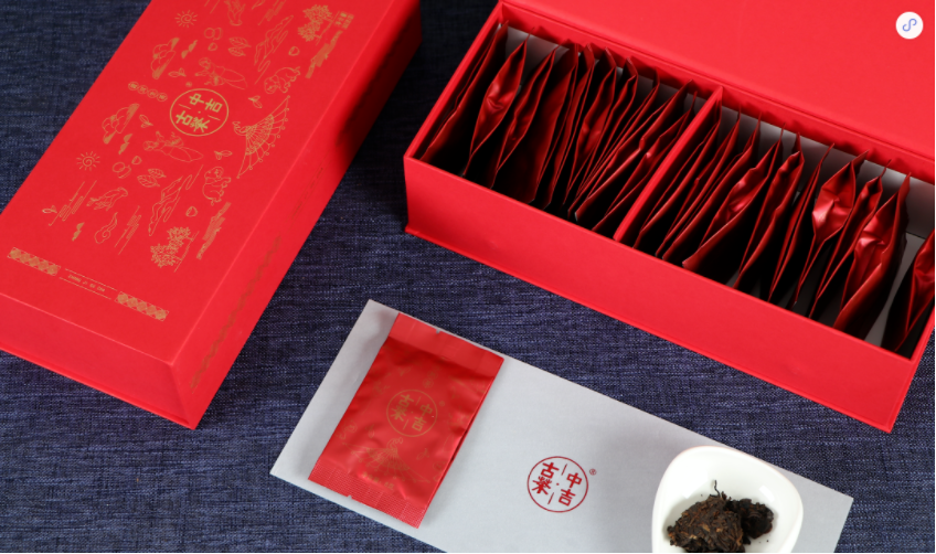 中吉古茶小单泡礼盒分为红蓝两色、生熟两款,经典中吉红为熟茶,采用勐海产区原料的标杆熟茶工艺配合云车间高净度发酵;尊贵帝王蓝为生茶,原料采用易武核心产区高嫩度春茶。规格统一为8克/袋,20袋/盒,单泡单袋随意搭配,会务商谈、好友分享、随手礼品都可尽情搭配。