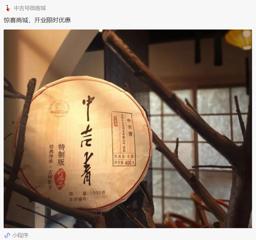 中吉号十五周年品牌新起点——中吉号品牌招商运营中心试营业期间,“中吉号微商城”小程序店庆活动同步进行中,一切只为给消费者更好的体验,带领名山古树普洱从云南茶山走向全国茶人的茶桌。