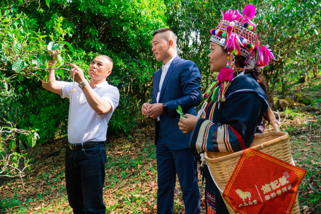 △老班章茶王地采摘现场(左一为云南省农业科学院茶叶研究所所长何青元,中间为八马茶业董事、副总经理何磊,右一为老班章茶王茶后树守护人杨红花)