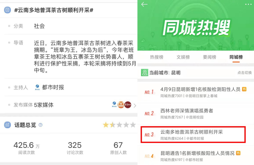本次活动受到新华社、云南、广东等地媒体以及各地茶友的关注,并在主流社交媒体平台上引发广泛话题讨论。截至4月13日中午12时,微博话题#云南多地普洱茶古树顺利开采#阅读量超425万,名列昆明同城热搜前三;抖音话题#信记号老班章冰岛茶王树#曝光量超145万,一度入选抖音食品饮料行业热门话题,总排名第二。