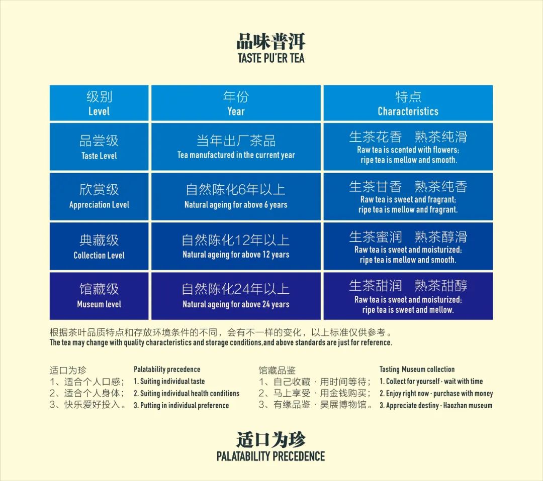 With round and full shape, glossy appearance, even, clear and strong trabs, the romantic taste of dried tea, the materials of Tian An Quan Shun ripe cake are sundried primary tea of large tea leaves in Yunnan. Being glossy and oily, stout and thick with visible leaves, now it’s aged ripe tea with 12 years.