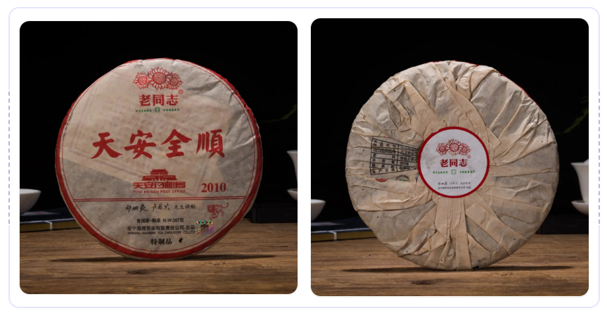 2010 Tian An Quan Shun ripe cake is personalized customization by Tian An Men Post Office. With sundried primary tea of large leaves in Menghai County, Yunnan being raw materials, it adheres to the formula of Mr. ZOU Bingliang and LU Guoling – tea making masters in China. Being elaborately made as per modern craft with traditional tea making essence, its tea soup is red and transparent with pure aroma and mellow taste.