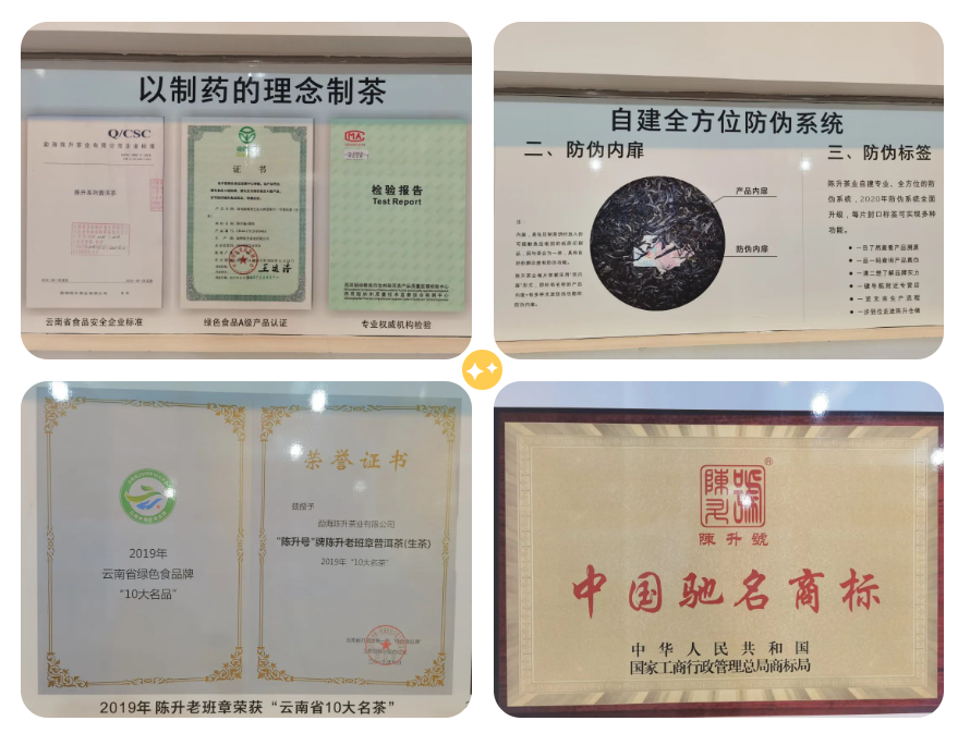 “陈升号”普洱茶多年来经各级质量技术监督部门检验,各项指标均达到国家标准要求,送检产品合格率达100%。企业获得SC、有机食品、绿色食品等多项认证。通过陈升茶业生产车间技术工人的不懈努力,确保了“陈升号”的每一款茶品,色香味俱全、甘活醇韵,极具特色。