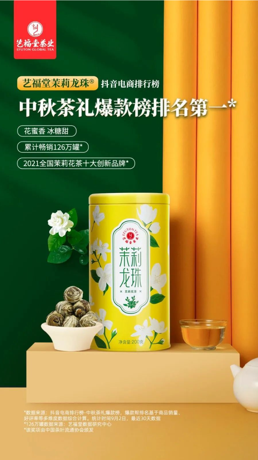 茶配月饼,健康长久。中秋茶礼送什么?抖音电商排行榜中秋茶礼爆款榜单给出了权威的答案。艺福堂茉莉龙珠继抖音618好物节珠宝文玩茶叶类目销量排名第一之后,荣登中秋茶礼爆款榜单第一!