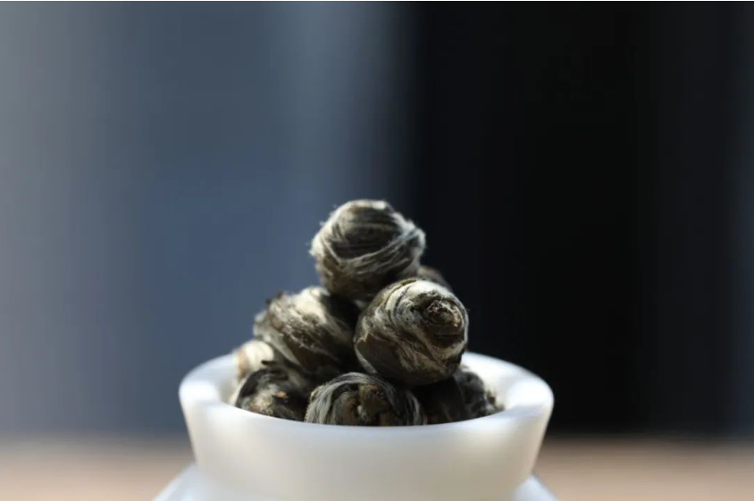 珠形茉莉花茶与普通的芽形茉莉花茶相比,多了一步手工成珠的过程。珠形茉莉花茶,因其独特的珠形结构,具备凝香、锁香的功能。在珠形茶坯与茉莉花窨制的过程中,茉莉鲜花的下花量比普通茉莉花茶更多,茶珠可以吸附更多的香气,包裹更多的香气。