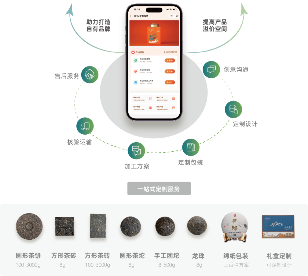 CRTTC根据茶企对产品的定制需求,为平台商户提供加工方案、创意设计、包装定制等一站式定制服务。助力茶企打造自有品牌,实现从原料茶到品牌茶的跃升,提高产品溢价空间,提升产品盈利能力。