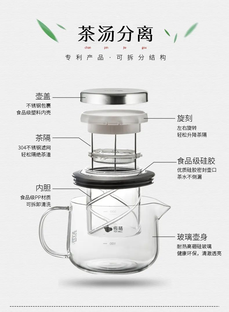 恒福得意壶壶身采用高硼硅玻璃材质,壶内胆采用食品级PP不锈钢材质打造,具有高强度、耐高温、高透光率和稳定性强等特点,最高可耐受150摄氏度高温而不炸裂。