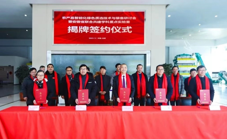 研讨会上,在认真听取了农产品智能化绿色质选技术与装备创新开发的情况以及安徽省联合共建学科重点实验室建设情况的汇报后,与会代表展开了热烈的讨论和详细的交流。随后参观完捷迅光电实验室及产品研发体验中心,原安徽省农业科学院院长、研究员、博导杨剑波,原农业农村厅一级巡视员、安徽省绿色食品产业发展服务联盟名誉理事长王华,捷迅光电董事长高小荣,安徽省绿色农产品质量安全管理站站长刘成美,捷迅光电常务副总经理陈振林共同为实验室揭牌。会上,还举行了校企、院企产学研合作以及企企协同创新合作等多场签约。