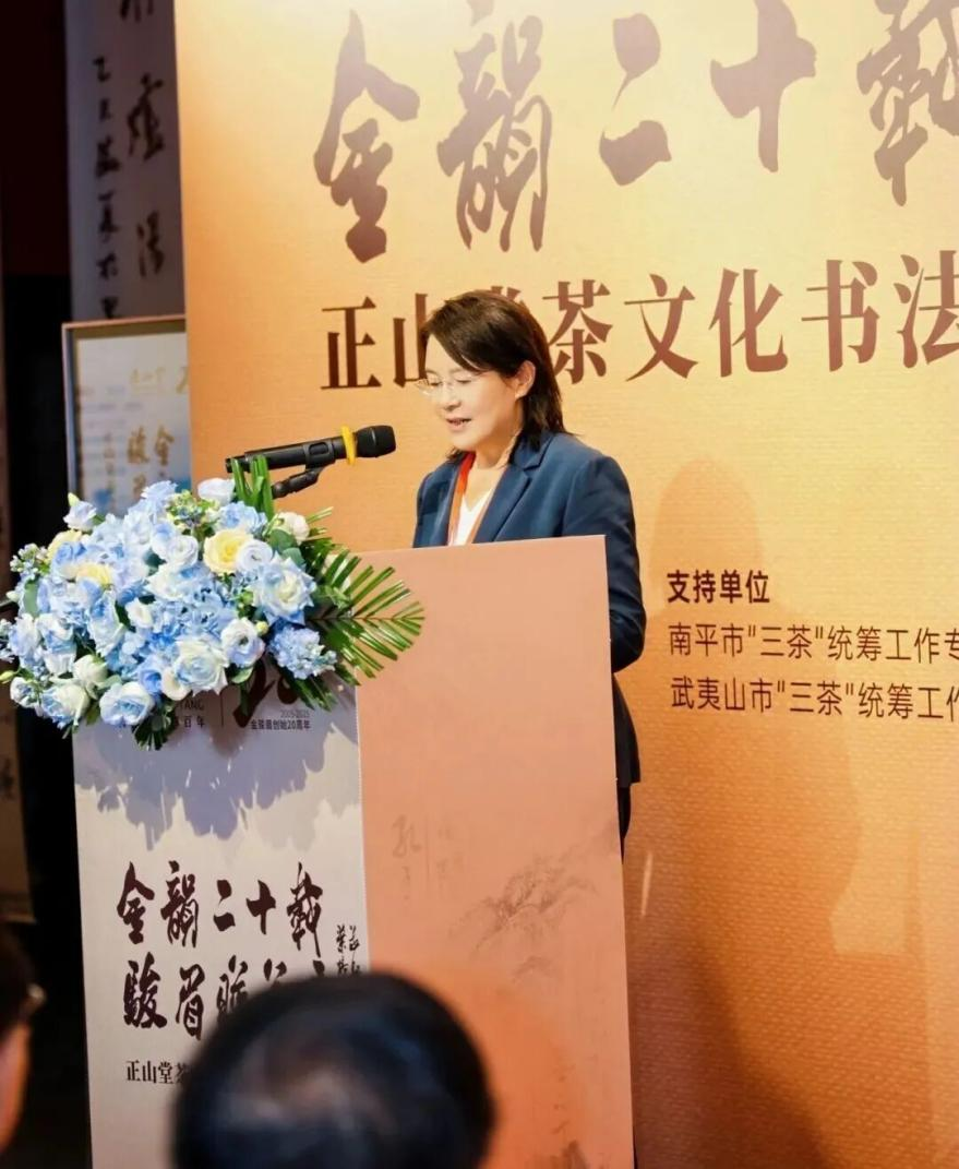 9月13日,由海峡两岸茶业交流协会、中国茶叶流通协会、福建省书法家协会指导,福建正山堂茶业有限责任公司与北京语言大学中国书法国际传播研究院联合主办的“金韵二十载,骏眉映华章——正山堂茶文化书法名家邀请展”在福州画院美术馆隆重启幕。受王庆会长委托,中华全国供销合作总社科教社团部一级巡视员、中国茶叶流通协会常务副会长兼法定代表人倪静出席开幕式并致辞。
