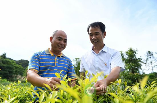 近日,在定南县龙塘镇忠诚村黄金芽茶种植基地,该村定补干部郭福星(右)正在向村民询问茶叶长势情况。近年来,该村依托生态资源优势,采取“党建+基地+农户(贫困户)”模式,引导村民发展黄金芽茶种植产业。目前,该基地种植黄金芽茶面积50多亩,年产茶叶800多斤,收入近20万元,带动农户30人就业增收。