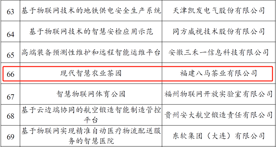 日前,工信部公示了2021年物联网示范项目,共179个项目入选。福建省共有11个项目入围,其中,八马茶业“现代智慧农业茶园”入围“融合应用创新类”项目。