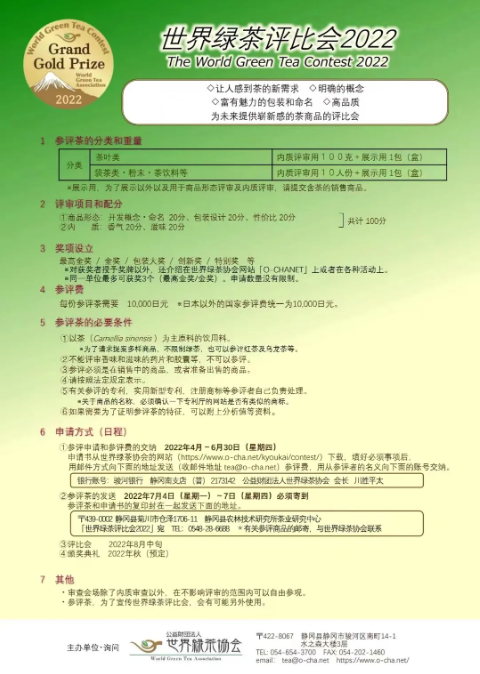 据了解,世界绿茶协会是日本静冈县政府成立的一个组织,旨在通过传播绿茶的传统和对其健康及商业特性的了解,进一步发展绿茶生产、文化和理念。会上有来自中国、日本、韩国等主要产茶国或地区的茶企茶品参评,审评专家团也是跨国组成,除重点考察茶的生长环境、工艺、外形、内质香气和口感等传统评选项目外,还从开发理念、命名、包装设计等方面进行严格审评。