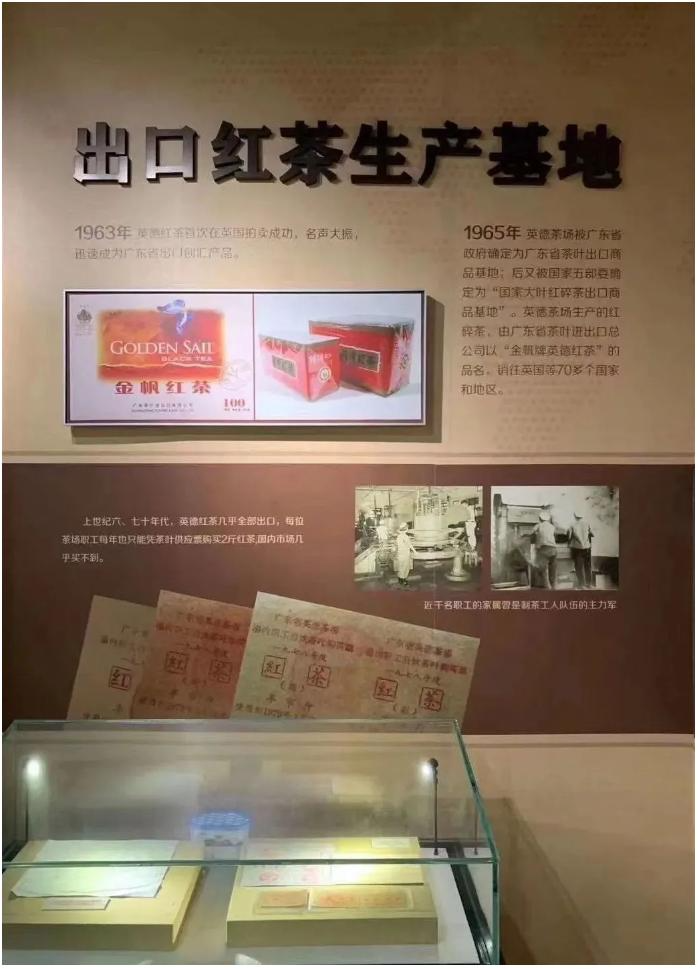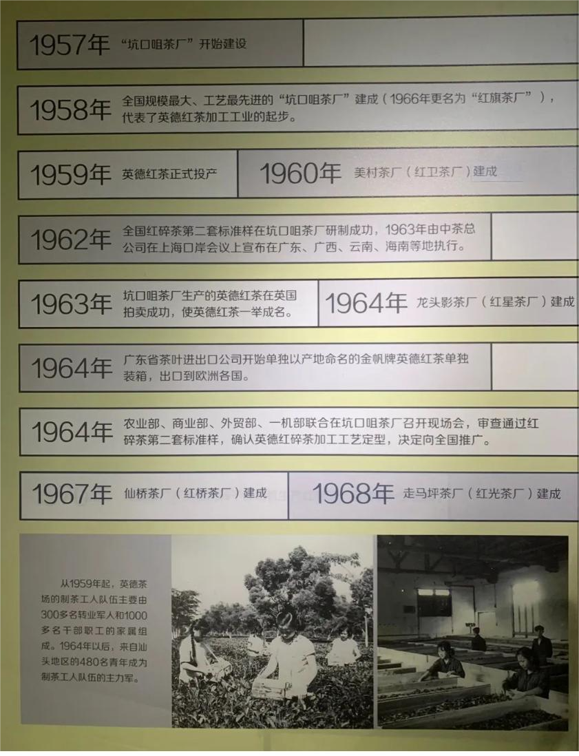 1956年英德成功引种优良茶树品种---云南大叶种,开启了大面积种茶历史。1959年英德茶场开始生产红茶,经反复试验,全国红碎茶第二套标准样于1962年在坑口咀茶厂研制成功,并于次年由中茶总公司宣布在各出口口岸实施。1964年,英德红茶在英国拍卖成功,开始以广东茶叶进出口公司“金帆牌英德红茶”单独命名出口到英国等欧洲市场,以其香气浓郁滋味醇和汤色红亮等特点而畅销,1965年,英德茶场被广东省政府确定为广东茶叶进出口公司的出口商品基地,从此英德红茶得到迅速发展,名扬四海。