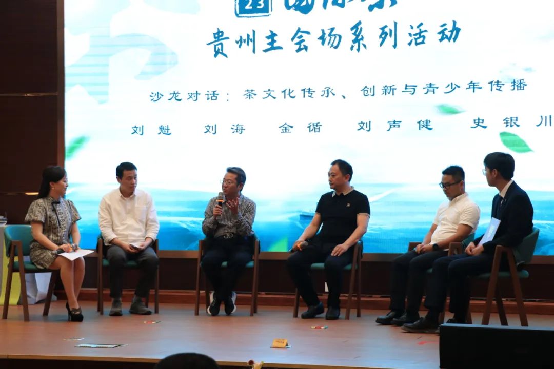 沙龙对话环节,特邀传统茶产业代表、兰馨品牌董事长金循,抹茶产业代表、贵茶集团副总刘海,潮生活品牌代表、去茶山创始人刘声健,新茶饮代表、甲秀茶品牌联合创始人史银川与贵州大学团委书记刘魁共话“茶文化传承、创新与青少年传播”。