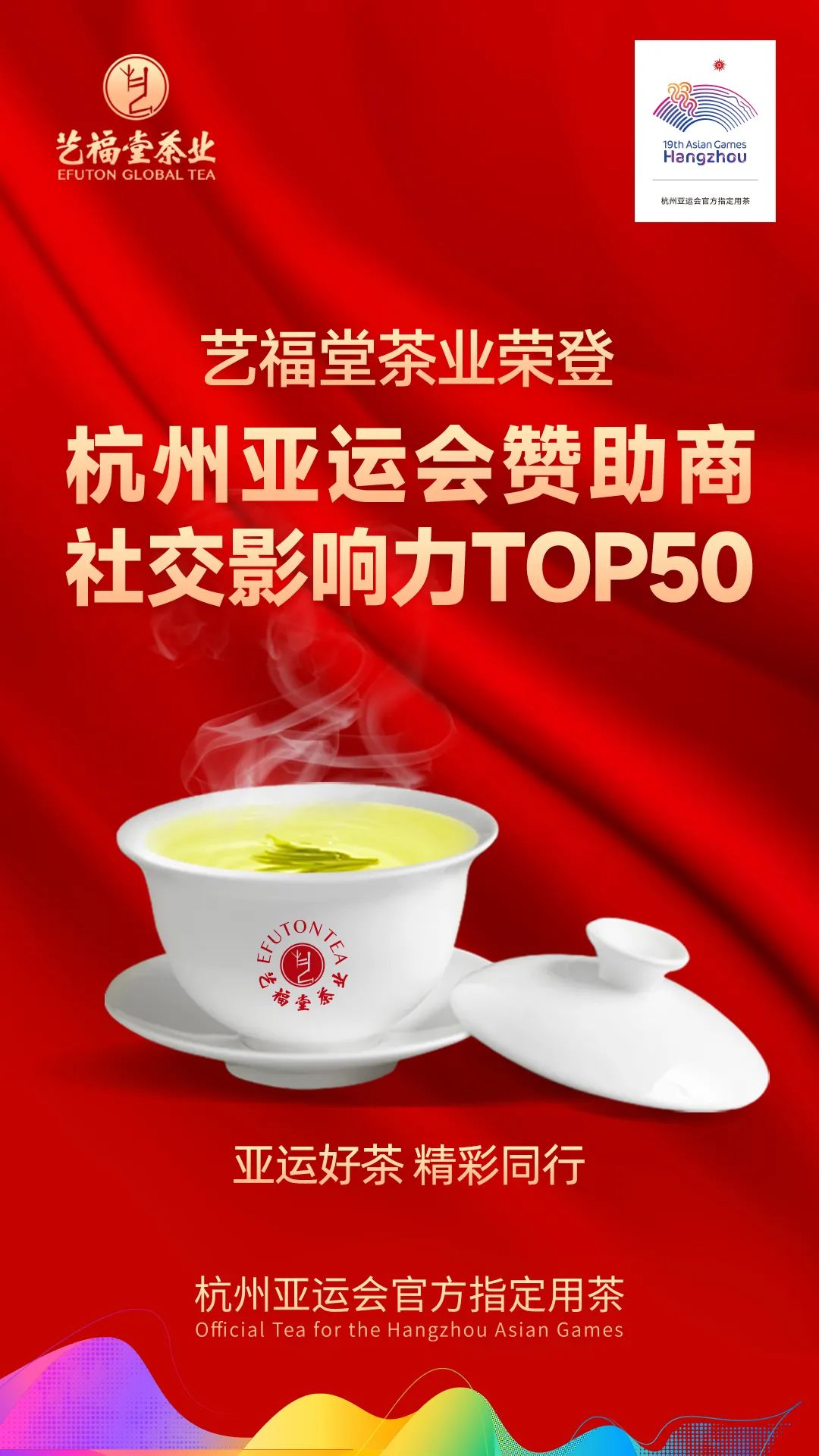 近日,杭州亚运会赞助商「社交影响力TOP50」出炉,艺福堂茶业从121个类别176家赞助企业中脱颖而出,入选2023杭州第19届亚运会赞助商社交影响力TOP50!